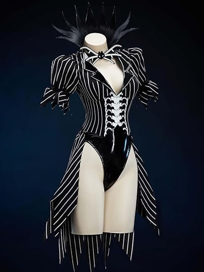 This all-in-one set features chic black-white stripes and a unique clear bone print for a striking effect. It combines the classic bunny girl fit with stretchy PU leather patchwork on the lower half.
