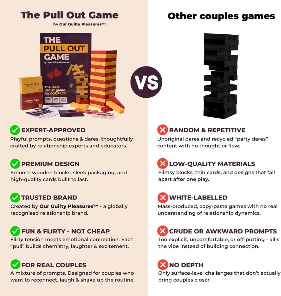 The Pull Out Game is a flirty stacking game for couples packed with dares, laughter, and playful tension. It is perfect for couples seeking playful interaction. This game injects exciting energy into any date. It promises laughter and physical connection.